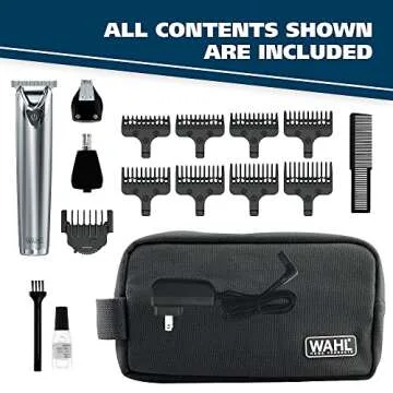 attachments: a T-Blade for precise beard and mustache trimming, a