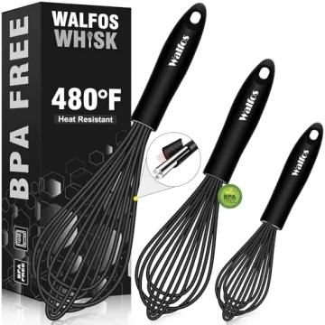 Show more Discover the ultimate kitchen companion with the Walfos Silicone Whisk Set, designed to elevate your cooking experience while ensuring your cookware remains scratch-free. Crafted from high-quality materials, this set includes three whisks in sizes of 8.5 inches, 9 inches, and 11 inches, perfect for any culinary task, from whipping up eggs to aerating batters. The sturdy stainless steel whisk wires are coated with a 0.3 mm soft silicone layer, providing a protective barrier that prevents any scratches on your precious pots and pans. And with a heat resistance of up to 480℉, you can use these whisks with confidence, even for high-temperature recipes!