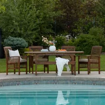 Show moreIntroducing the Walker Edison Maui Modern 6 Piece Solid Acacia Wood Slatted Outdoor Dining Set, a perfect blend of style, durability, and functionality. Designed to elevate your outdoor dining experience, this set features a stunning dark brown finish and boasts a contemporary aesthetic that harmoniously fits any patio or outdoor setting. With dimensions that accommodate both intimate gatherings and larger social events, the set includes a spacious dining table, four comfortable chairs, and a stylish bench, making it ideal for family meals or entertaining friends.