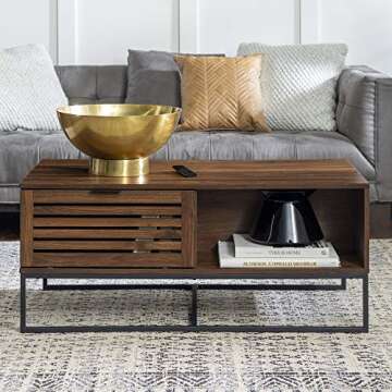 Show moreIntroducing the **Walker Edison Modern Slatted Wood Rectangle Coffee Table**, a stunning centerpiece designed to elevate your living space. Measuring 18" H x 42" L x 22" W, this coffee table perfectly blends functionality with contemporary aesthetics. Made of high-quality MDF and laminate with a beautiful dark walnut finish, it provides a luxurious look without compromising on durability. The sleek black powder-coated metal accents add a touch of modernity, ensuring that this table not only serves as a practical furniture piece but also as a stylish element in your home decor.