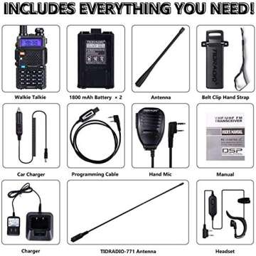 Walkie Talkie UV-5R Dual Band Two Way ( Ham ) Radio with one more 1800mAh Battery Car Charge Hand Mic and TIDRADIO NA-771 Antenna