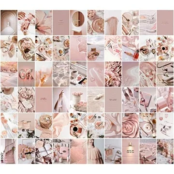 The collage kit includes 60 unique rosy pink aesthetic pictures, each measuring 4x6 inches, along with double-sided glue dots for easy hanging.