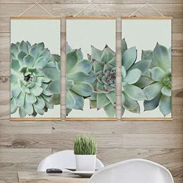 Show more Elevate your home decor with the stunning wall26 3 Panel Hanging Poster, featuring a vibrant closeup of succulent plants. This beautifully designed artwork is printed on high-quality PVC, ensuring not only stunning visuals but also remarkable durability and longevity. Each of the three panels measures 18"x12", combining to create a spectacular 18"x36" display that instantly draws the eye and adds a touch of nature’s beauty to any space. The poster comes expertly stretched and fitted into magnetic wooden frames, making it easy to hang and reposition without hassle. Ideal for any room in the house, this decoration effortlessly complements a variety of interior styles.