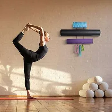 Show more Introducing the Wallniture Guru Wall Mount Yoga Mat Home Gym Organizer – your go-to solution for a clutter-free workout space! Designed with efficiency in mind, this versatile yoga mat holder not only provides a perfect storage solution for your yoga mats but also accommodates foam rollers, workout bands, and other fitness accessories. The stylish black metal design of this 3-sectional rack brings a chic aesthetic to your home gym while ensuring that your equipment is always within easy reach. Say goodbye to messy floors and tangled cords, and hello to a well-organized workout area!