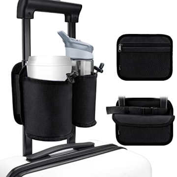Show moreIntroducing the WALNEW Luggage Travel Cup Holders – the ultimate travel companion designed to make your journey smoother and more enjoyable. Perfectly tailored for roll-on suitcase handles, this innovative drink carrier allows you to keep your beverages close at hand without the hassle. Featuring two front cup pockets to securely hold your drinks and an additional zippered pocket for essentials like passports and phones, this travel accessory is a must-have for anyone on the go. The waterproof material ensures your luggage stays clean and dry, while its lightweight and durable design means it won't add unnecessary bulk to your travel gear.
