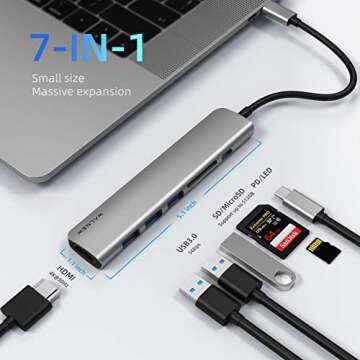 Show more This extraordinary 7-in-1 USB C Hub is a game changer for tech enthusiasts and professionals alike. Designed specifically to extend a laptop's USB-C capabilities, this compact but powerful adapter offers an impressive array of features. With three USB 3.0 ports, a crystal clear 4K HDMI output, and dedicated slots for both SD and TF cards, this hub allows for seamless multitasking without missing a beat.