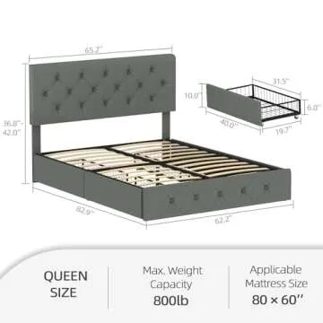 Show more Experience the perfect blend of functionality and style with the Wancla Queen Size Bed Frame Platform. This remarkable bed frame not only enhances your sleep space but also upgrades your room’s decor with its sleek, dark grey design. Featuring an adjustable tufted button Leathaire headboard, this frame accommodates varying mattress depths between 37.2'' to 41.9'', ensuring optimal comfort as you drift off to sleep. The inclusion of four spacious storage drawers provides unparalleled organization without sacrificing aesthetics, making it a must-have for any modern bedroom.