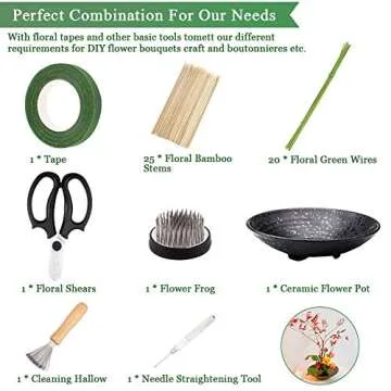 Introducing the WANDIC Flower Arrangement Kit, a comprehensive set designed for both novice and expert florists alike! This thoughtfully curated kit contains 51 essential components, including a round flower holder, an elegant ceramic flower pot, a specialized kenzan needle cleaning pin, and a rake to maintain your floral arrangement tools. You'll also find floral stems and floral tape, enabling you to dive into the creative world of floral artistry without searching for additional materials....