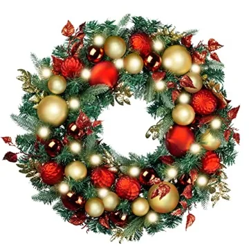 Show more Introducing the WANNA-CUL Pre-Lit 30 Inch Luxury Christmas Wreath, a magnificent holiday decoration that transforms your home into a winter wonderland! Beautifully designed with exquisite red and gold hues, this wreath features handcrafted elements that cascade beautifully, capturing the essence of the festive spirit. Made with high-quality artificial greenery that mimics real spruce, its realistic appearance is sure to impress your guests and elevate your holiday decor to new heights.