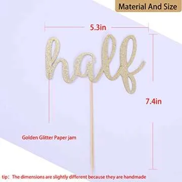 Show moreIntroducing the stunning WAOUH Half Cake Topper for Birthday, a delightful addition that will make any birthday celebration truly special. Crafted with care and expertise, this beautiful cake topper features a charming "Half" cutout covered in luxurious gold glitter, ensuring your cake will gleam and glimmer like never before. Measuring an overall size of 9.6 x 6.8 inches, it is designed to perfectly complement your cake while bringing joy and excitement to the festivities. The bamboo stick at the bottom provides a sturdy hold, allowing for easy placement atop any cake, making it a hassle-free addition to your party decorations.