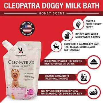 Show more Transform your dog's bath time into a luxurious spa-like experience with the Milk Bath. This unique product promises to enhance your pet’s wellbeing by creating an atmosphere filled with tranquility and relaxation. Upon pouring the powdered Milk Bath into warm water, you’ll witness a spectacular transformation as the powder fizzles into delicate effervescent bubbles that gently massage and soothe your dog's coat. The combination of premium, natural ingredients, including 100% Natural Whole Milk Powder and Honey, serves as a gentle cleanser and moisturizer, leaving your dog's fur feeling irresistibly soft like silk. Say goodbye to stress and hello to delightful bath time!