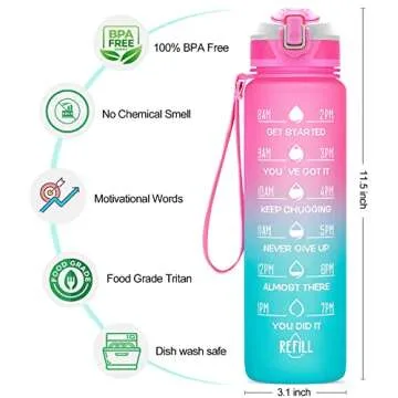 Show moreIntroducing the 32oz Motivational Water Bottle, the ultimate hydration companion that combines functionality, safety, and style into one sleek design. Crafted from premium, food-grade Tritan, this water bottle is guaranteed to be 100% BPA-free, ensuring that no harmful chemicals leach into your beverages, regardless of temperature. Designed for the active lifestyle, it’s ideal for those who seek to drink more water daily without compromising on safety or aesthetics. With a generous 32oz capacity, this bottle allows you to track your daily water intake effortlessly, featuring thoughtfully placed time markers and encouraging motivational quotes that inspire you to stay hydrated and healthy.