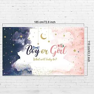 Show more Make your gender reveal party unforgettable with our stunning Watercolor Gender Reveal Decorations Backdrop Banner. Measuring an impressive 72.8 x 43.3 inches, this large backdrop is perfect for capturing precious moments and creating a visual spectacle at your event. Whether it's capturing that all-important moment of revelation or simply as an elegant decor piece, the navy blue and pink design harmonizes beautifully, making it suitable for both traditional and modern themes. Crafted from high-quality, reliable fabric, this backdrop is lightweight yet durable, ensuring it withstands any festivities while remaining easy to transport and hang.