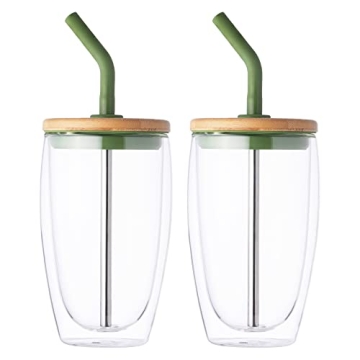 Wateren Iced Coffee Tumbler Set – 15oz Double Wall Glass with Bamboo Lids and Straws