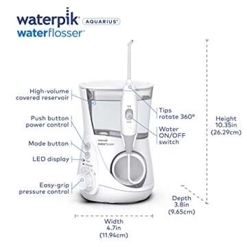 Show moreThe Waterpik Aquarius Water Flosser Professional (WP-660) offers a high-tech solution for maintaining optimal oral health. This ADA-accepted device caters to a wide range of dental care needs with its powerful electric power system and customizable features, including 10 different pressure settings and 7 interchangeable tips to accommodate multiple users. Ideal for individuals with braces or other specific dental care requirements, this device ensures a deep clean that traditional brushing and flossing can't match.