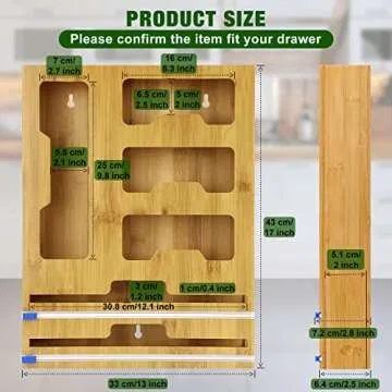 Show more Transform your kitchen into a well-organized haven with our innovative 6 IN 1 Bag Organizer and Wrap Dispenser. This remarkable product combines 4 bag storage compartments and 2 wrap dispensers, along with 15 easy-to-use labels, ensuring that your space is not only neat but also efficient. Made from 100% natural materials, this organizer is both safe and lightweight, making it the perfect addition to any kitchen.