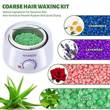 The NYANDU Waxing Kit effectively removes coarse hair from areas like eyebrows, lips, bikini lines, and legs.
