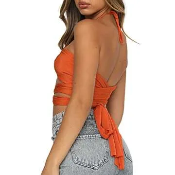 WAYMODE Women's Sexy Sleeveless Halter Crisscross Cami Lace Up Self Tie Backless Crop Tops Orange Small