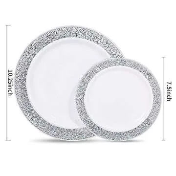 WDF 102PCS Silver Plastic Plates-Disposable Plates with Silver Rim- Lace Design Plates including 51Plastic Dinner Plates 10.25inch,51 Salad Plates 7.5inch
