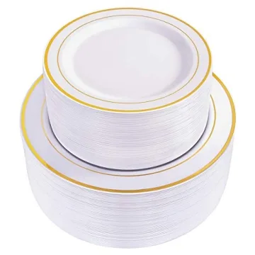 With their stunning **white color accented by a chic gold rim**, these plates add a sophisticated touch to any occasion, whether it's a simple birthday party or an extravagant wedding. Their exquisite design allows you to create a festive atmosphere while maintaining a classy look. And with their **disposability**, you can easily set the table for a banquet while eliminating the worry of cleanup.