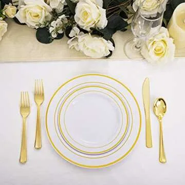 Ideal for a variety of events, these gorgeous gold rimmed plates shine during Thanksgiving, Wedding Receptions, Rehearsal Dinners, Graduations, Anniversaries, Birthday Parties, BBQs, and more. Regardless of the occasion, they add an air of sophistication and charm, ensuring your tables present beautifully. Make your next event unforgettable!