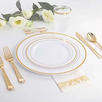 WDF 25Guest Gold Plastic Plates - Heavy Duty Gold Plastic Plates Dinnerware - Include 25 DinnerPlates 25 Salad Plates 50 Forks 25 Knives 25 Spoons 25 Cups 25 Mini Forks