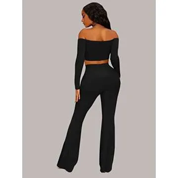 Show moreIntroducing the latest addition to your wardrobe: the WDIRARA Women's 2 Piece Outfit Off The Shoulder Long Sleeve Crop Top and Flare Leg Pants Set in stunning black. This chic ensemble is designed for the modern woman who isn’t afraid to make a statement. The stylish off-shoulder crop top flatters the shoulders, while the long sleeves add an air of elegance. With a soft and stretchy fabric, you'll feel comfortable and confident whether you're dancing the night away or enjoying brunch with friends.