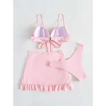 WDIRARA Women's 3 Pieces Tie Front Push Up Bikini Swimsuit with Ruched Ruffle Hem Beach Skirt Pink XS