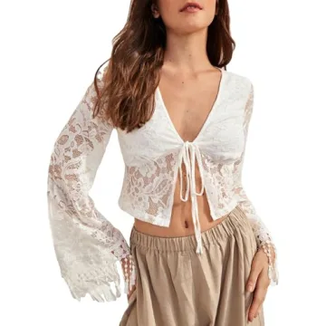 Show moreIntroducing the WDIRARA Women's Contrast Floral Lace Mesh Sheer Tie Front Fringe Trim Flared Long Sleeve Sexy Crop Top, a masterpiece that combines femininity and flair for the modern woman. This chic top showcases an exquisite blend of floral lace and sheer mesh, adding a touch of romance to any outfit. Its unique tie front design enhances your silhouette, while the fringe trim along the sleeves offers a playful and vibrant style. Made with soft, stretchy fabric, this crop top promises comfort without compromising on style, making it perfect for all-day wear.