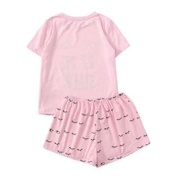 WDIRARA Women's Cute Cartoon Print Closed Eyes Print Tee and Shorts Pajama Set Pink M