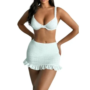 Show more Introducing the WDIRARA Women's Eyelet Embroidery Ruffle Hem Swimsuit Bikini Top and Skirt Set, your must-have for soaking up the sun in style! This two-piece bathing suit, designed in a chic white hue, features stunning eyelet embroidery that exudes a sweet, feminine charm. The ruffle hem adds a playful touch while providing just the right amount of coverage, making it both stylish and practical. Crafted from a highly stretchy and soft fabric, this swimsuit ensures optimal comfort whether you're lounging by the pool, taking a dip in the ocean, or enjoying a spa day. With adjustable straps, you can customize the fit for confidence and ease all day long.