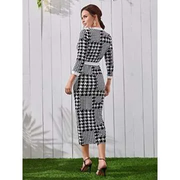 WDIRARA Women's Houndstooth Plaid V Neck Split Hem Belted Button Long Sleeve Bodycon Church Pencil Maxi Dress Multicolour S