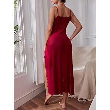 WDIRARA Women's Lace Trim Side Slit V Neck Long Mesh Chemise Nightgown Slip Dress Burgundy XS