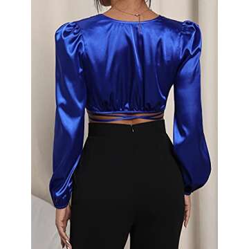WDIRARA Women's Satin Deep V Neck Crisscross Wrap Tie Front Long Sleeve Crop Top Royal Blue S