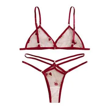 Lilosy Sexy Cute Underwire Push Up Strappy Heart Embroidered Mesh Sheer Lingerie Set for Women See T...