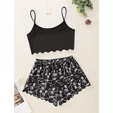 WDIRARA Women's Sleepwear Skull Print Strap Pajama Set Cami and Shorts Black Bow L