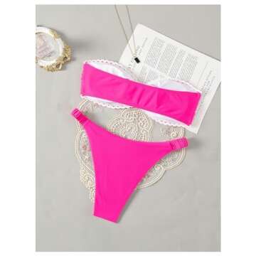 Introducing the **WDIRARA Women's Two Piece Bandeau Ruched Swimsuit Ring Scallop Trim High Cut Bikini Set**, your new go-to swimwear for this season's beach outings. This stylish bikini features a charming strapless design that beautifully accentuates your shoulders, complemented by cute ring details and ruched accents that enhance your figure. Crafted from high-stretch fabric, this bikini promises exceptional comfort and flexibility, making it a perfect fit for all-day wear. The high-cut legs give a flattering...
