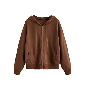 WDIRARA Women's Zip Front Drawstring Hoodie Pullover Long Sleeve Casual Sweatshirt Top Brown L