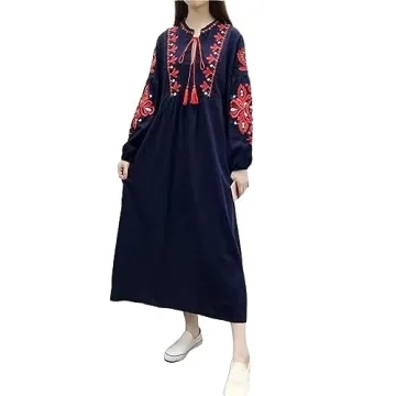 WDZIZFG Women's Bohemian Ethnic Style Vacation Long-Sleeved Embroidered Dress (Color : Navy Blue, Size : Average Size)