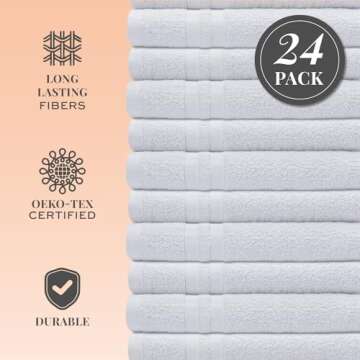 Show more Transform your bathroom into a luxurious haven with our Value Bundle of bath towels! This set includes 24 high-quality cotton washcloths designed to enhance your after-bath experience, providing unmatched comfort and absorbency. Made from 100% cotton, these towels are lightweight yet durable, weighing just 1 lb per dozen, ensuring they stand the test of time while maintaining their softness. With double-stitched edges, these towels are built for longevity, resisting everyday wear and tear.
