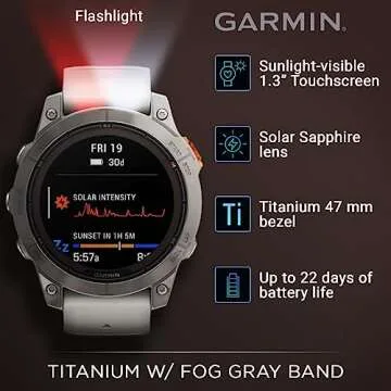 Show more Introducing the Garmin Fenix 7 Pro Sapphire Solar Edition – a high-performance smartwatch that blends cutting-edge technology with robust design, perfect for both everyday use and adventurous excursions. Featuring a durable 47 mm Titanium bezel and a stylish Fog Gray/Ember Orange silicone band, this smartwatch is made to withstand the elements while you conquer your fitness goals. With its brilliant sunlight-visible 1.3" touchscreen, you'll enjoy vibrant visuals and responsive interaction, all powered by a scratch-resistant sapphire solar charging lens. This exceptional combination makes the Fenix 7 Pro the ultimate companion for athletes and outdoor lovers alike.