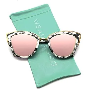 Show more Introducing WearMe Pro Women’s Cat Eye Sunglasses, the perfect blend of style and functionality! Designed for fashion-forward individuals, these sunglasses boast a striking Marble White Frame paired with Mirrored Pink Lenses. These frames are not just a fashion statement but also offer top-tier protection for your eyes—featuring mirrored lenses that shield against harmful UVA and UVB rays with a guaranteed 99.99% protection rate. Their oversized cateye shape is exceptionally flattering, making them a go-to accessory for any outfit or occasion.