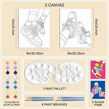 Show moreExperience the joy of creativity with the WEBEEDY 2 Pack 8x10 Pre Drawn Canvas Paint Kit. This thoughtfully curated painting set is specifically designed to inspire both budding artists and experienced painters alike. Featuring two charming sneaker-themed canvases, each pre-drawn and ready for your unique touch, it encourages you to unleash your imagination and create beautiful pieces of art. Perfectly suited for couples, families, or friends, this kit transforms painting into a fun, memorable activity that not only nurtures your artistic skills but also strengthens bonds during shared experiences.