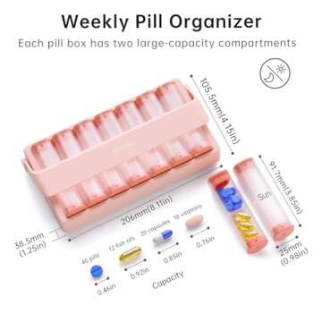 Show moreThe KOVIUU Weekly Pill Organizer is a revolutionary solution for those who take medication or supplements twice a day. Designed with 14 large compartments accommodating up to 40 pills, 20 capsules, 12 fish oils, or 18 vitamins, this travel-friendly pill organizer takes the fuss out of daily dosing. Each compartment is expertly divided into AM and PM slots and features intuitive silicone caps that remind you when to take your medicine, ensuring you never miss a dose.