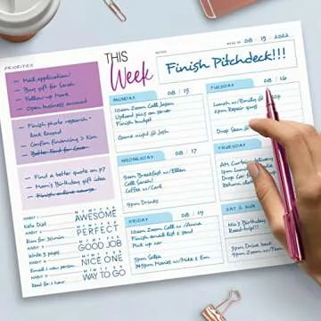 Show more Introducing the Weekly Planner Pad, your ultimate companion for enhancing productivity in any environment - be it for work, school, or daily life. Measuring a compact yet spacious 11 x 8.5 inches, this undated planner features 52 tear-off sheets designed to last an entire year. Each page is crafted from premium, smooth, and bleed-free paper, ensuring your notes and plans remain clear and legible. The sturdy cardboard back provides a solid writing surface, making it versatile for home, office, and on-the-go use.