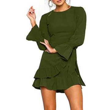 WEEPINLEE Womens Long Sleeve Round Neck Ruffles Wrap Dresses Party Dress (Army Green, S)