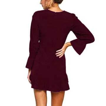 WEEPINLEE Womens Long Sleeve Round Neck Ruffles Wrap Dresses Party Dress (Wine Red, S)
