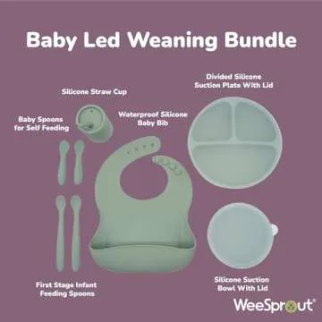 WeeSprout Baby Led Weaning Bundle, Silicone Suction Bowl, Spoons, Bib & Cup, Develops Self Feeding Skills, Dishwasher Safe (Green)