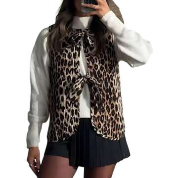 WEIIYONN Tie Front Vests for Women Graphic Cottagecore Women’s Padded Gilet Quilted Puffer Vest Sleeveless Bow Bands Tie Tops (Leopard-1,S,Small,Regular,Regular)