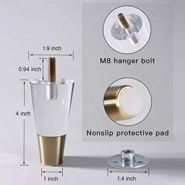 WEKIS Acrylic Furniture Legs 4 Inch Set of 4, Modern Clear Crystal Heavy Duty Furniture Replacement Legs for Sofa, Bench, Couch, Cabinet, TV Stand, Chair, Dresser